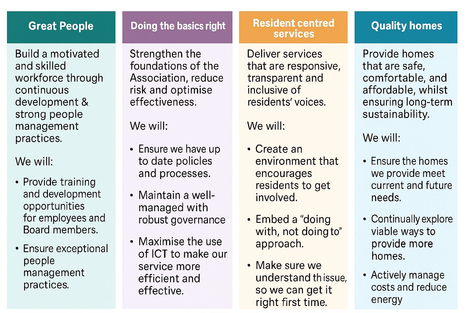 Our Strategic Plan sets out four objectives; these objectives have been developed in response to the current housing environment, available opportunities, and the challenges we face. The action plan is reviewed, with an annual progress update presented to the Board.